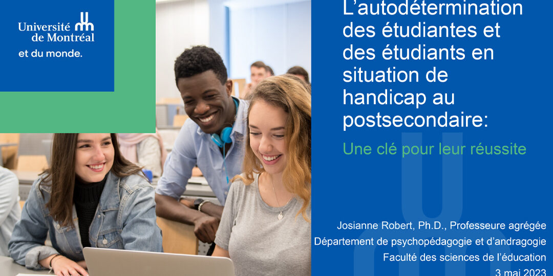 Josianne Robert, professeure agrégée à l’Université de Montréal, à aborder l’autodétermination en lien avec la réussite des étudiantes et des étudiants en situation de handicap. Cette présentation vise à sensibiliser les professionnelles et les professionnels des milieux collégiaux et universitaires à l’importance de ce concept dans leur accompagnement des personnes étudiantes.