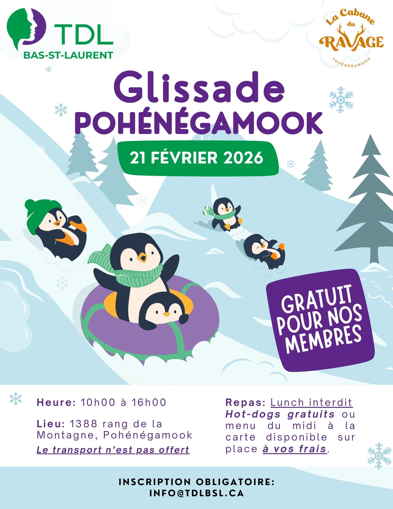 TDL Bas-St-Laurent invite ses membres à une activité familiale de glissade à La Cabane du Ravage de Pohénégamook.