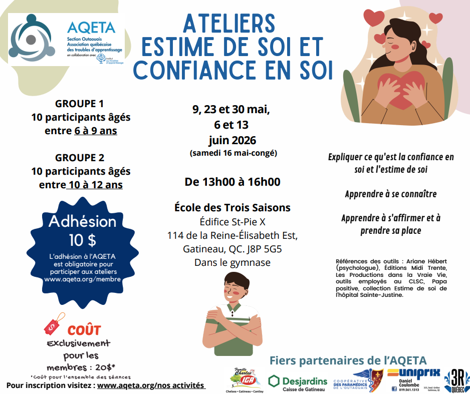 Adhésion à l’AQETA : 10 $ (obligatoire pour participer aux ateliers)