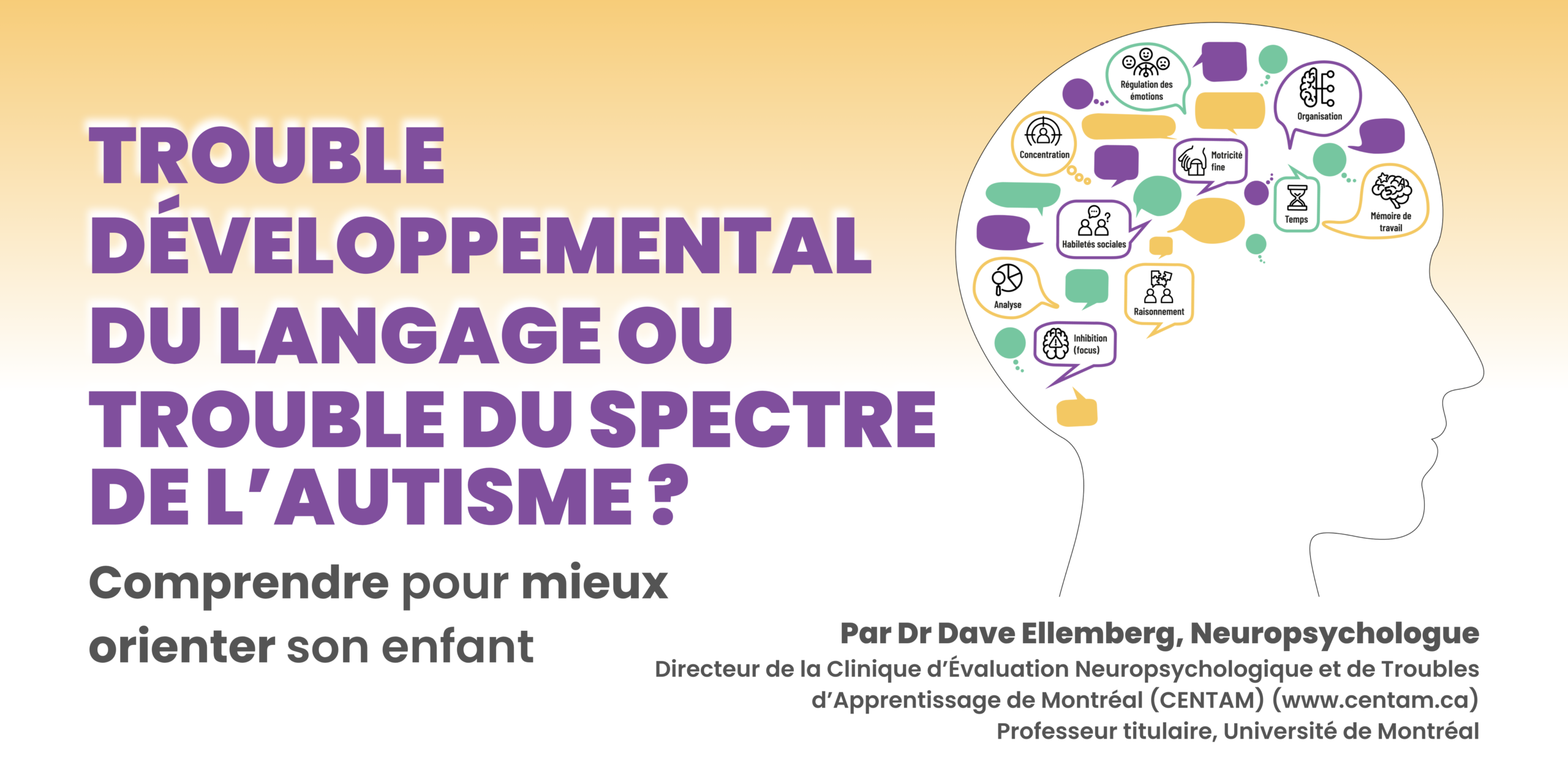 Dr Dave Ellemberg, Professeur titulaire et chercheur à l’Université de Montréal, Neuropsychologue clinicien, fondateur de la CENTAM (Clinique d’Évaluation Neuropsychologique et des Troubles d’Apprentissage de Montréal) et membre du conseil d’administration de l’association québécoise des troubles d’apprentissages de 2004 à 2010. Dr Ellemberg a plus de quatre-vingts de publications scientifiques à son actif et il a donné plus de deux cents conférences en Amérique, Europe et Asie présentant les résultats de ses recherches sur le développement du cerveau humain. Il est récipiendaire du nombreux prix incluant le certificat d’excellence de la Société Canadienne de Psychologie, du prix Cerveau en Tête des Instituts de Recherche en Santé du Canada et du prix E. A. Baker du Conseil Canadien de Recherche Médicale.